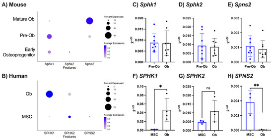 Murine and human osteoblasts express genes involved in S1P production. (A) Clustered murine early osteoprogenitors, pre-osteoblasts (Pre-Ob), and mature osteoblasts (Mature Ob) were analysed for expression of S1P production genes. Dotplot of Sphk1, Sphk2, and Spns2 expression in each murine osteoblast subset, where circle size represents percentage of cells expressing the gene and colour indicates average expression value. (B) Clustered human MSCs and osteoblasts (Ob) were analysed for expression of S1P receptor genes. Dotplot of SPHK1, SPHK2, and SPNS2 expression in each human osteoblast subset. (C–E) Calvarial osteoblasts were cultured in control (Pre-Ob, blue, n = 8) or osteogenic media (Ob, black, n = 8) for 8 days and gene expression for (C) Sphk1, (D) Sphk2, and (E) Spns2 was normalised as 2−ΔCt to β2m. (F–H) Human MSCs (blue, n = 3) and human primary osteoblasts (Ob, black, n = 11) were analysed for expression of (F) SPHK1, (G) SPHK2, and (H) SPNS2 and data were normalised as 2−ΔCt to β2M. Data are mean ± SEM, with each point representing an individual experiment/donor. (C–H) * = p < 0.05; ** = p < 0.01 by unpaired t-test.