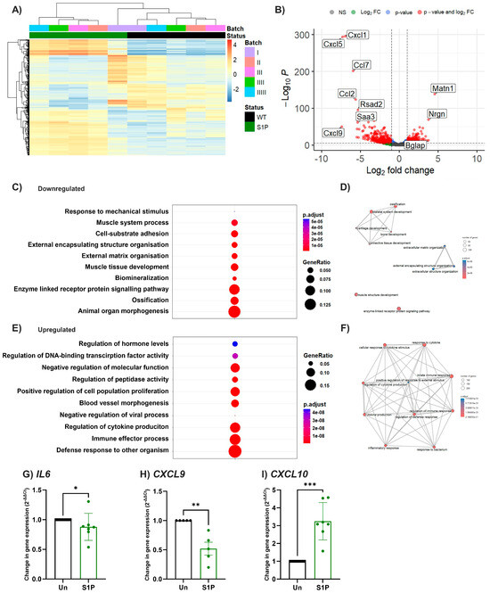 S1P upregulated inflammatory markers in murine osteoblasts. Bulk RNAseq analysis of primary calvarial osteoblasts following 8 days of differentiation in the presence or absence of S1P. (A) Heatmap and (B) volcano plot of differentially expressed genes following S1P treatment. Significantly different gene expression by both changes in p-value and log2FC values are shown in red. (C–F) Pathway analysis was performed on the use of clusterprofiler and gene set enrichment analysis. DotPlot of the top 10 (C) downregulated and (E) upregulated pathways ordered by adjusted p value. Circle size represents GeneRatio, whilst colour shows the adjusted p value. Emap plot of top 10 pathways (D) downregulated or (F) upregulated by S1P, with how the pathways map onto each other shown by connection lines, adjusted p-value by colour and number of genes involved by size of circle. (G–I) Human primary osteoblasts were differentiated and treated with or without S1P (1 µM) for 8 days. Gene expression of IL6 (G, n = 7), CXCL9 (H, n = 5), and CXCL10 (I, n = 7) were normalised as 2−ΔΔCt to untreated control. Data are mean ± SEM, with each point representing an individual experiment/donor. (G–I) * = p < 0.05; ** = p < 0.01, *** = p < 0.001 by Mann–Whitney U.