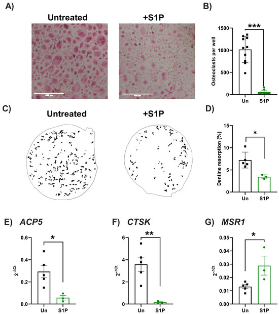 Subsequently, we assessed whether S1P also differentially regulated osteoclast differentiation and resorption activity using primary murine and human osteoclast precursors (monocytes) (Figure 4 and Figure 5). In human cells, S1P treatment significantly reduced the number of TRAP-positive osteoclasts and amount of resorption of dentine disks in response to RANKL-induced osteoclastogenesis when compared to RANKL-only treated cells (Figure 4A–D). Agreeing with these findings, S1P significantly decreased the expression of markers associated with osteoclast differentiation (ACP5, CTSK), whilst increasing the expression of the macrophage marker MSR1 (Figure 4E–G), skewing human monocyte differentiation towards a macrophage, rather than osteoclast, phenotype. In contrast, the number of TRAP-positive murine osteoclasts and their resorption on hydroxyapatite coated plates was significantly increased in response to S1P (Figure 5A–D). However, findings were not mirrored at the transcript level for markers of osteoclastogenesis, with no changes in expression of Acp5, Ctsk, or Msr1 seen following S1P treatment when compared to non-S1P-treated osteoclasts (Figure 5E–G). As seen with osteoblasts, these data indicate species-specific differences in the role of S1P during osteoclastogenesis. More importantly, S1P plays an inherent role in osteoblast–osteoclast coupling—favouring bone resorption in mice, but bone mineralisation/formation in humans.