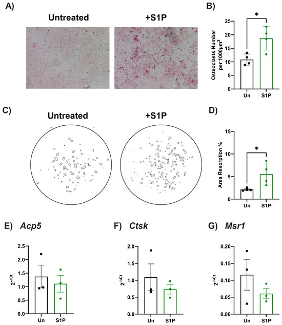 S1P increased osteoclastogenesis of primary murine monocytes. Murine bone marrow-derived monocytes (BMDM) were treated with M-CSF for 24 h before RANKL treatment. (A,B) RANKL-treated cells were either (untreated, black bars, n = 4), further stimulated with S1P (green bars, n = 4). (A) Representative images of untreated or S1P-treated wells stained for TRAP. (B) Osteoclast counts (TRAP-positive, multinucleated) in each condition and presented as number of osteoclasts per well. (C,D) RANKL-induced osteoclasts were cultured on hydroxyapatite coated plates for 8 days in the presence of vehicle control (untreated, black, n = 4) or S1P (green, n = 4) prior to cell removal and staining of resorption pits. (C) Representative images of masks generated to show areas resorbed by osteoclasts. (D) The resorption area was displayed as a percentage of the total area. (E,G) Cells were untreated (black, n = 5) or treated with RANKL only (black, n = 5) or treated with RANKL and S1P (green, n = 3 independent donors) for 8 days and gene expression for (E) Acp5, (F) Ctsk, and (G) Msr1 were analysed and normalised as 2−ΔCt to β2m. Data are mean ± SEM from (B) n = 10 from 3 independent donors, (D–G) n = 4 independent donors. * = p < 0.05 by unpaired t-test.