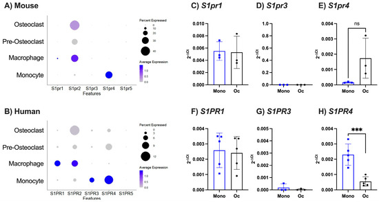 S1P receptor expression changes over osteoclastogenesis but not between species. (A,B) Analysis of publicly available single cell sequencing datasets (A) GSE147174 (mouse) and (E) GSE162454 (human) and looking at S1P receptors (S1PR1–S1PR5). Dotplot of clustered (A) murine monocytes, macrophages, pre-osteoclasts, and osteoclasts or (B) human monocytes, macrophages, pre-osteoclasts, and osteoclasts, showing expression of S1PR1-5, where circle size represents percentage of cells expressing the gene and colour indicates average expression value. (C–E) BMDMs cultured (8 days) with or without M-CSF and RANKL. Undifferentiated monocytes (Mono, blue, n = 3) or osteoclasts (Oc, black, n = 3), analysed for (C) S1pr1, (D) S1pr3, and (E) S1pr4. (F–H) Human monocytes derived from PBMCs cultured (8 days) with or without M-CSF and RANKL. Undifferentiated monocytes (Mono, blue, n = 5) or osteoclasts (Oc, black, n = 5), analysed for (F) S1PR1, (G) S1PR3, and (H) S1PR4. Data are displayed as 2−ΔCt, where ΔCt is the relative expression compared to β2m or β2M housekeeping gene. Data are mean ± SEM. *** = p < 0.001 by unpaired t-test.