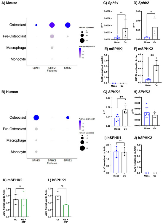 Kinases involved in S1P production vary over osteoclast differentiation and species. (A,B) Analysis of publicly available single cell sequencing datasets GSE147174 (mouse) and GSE162454 (Human) and looking at S1P producer (Sphk1 and Sphk2) and transporter (Spns2). (A) Dotplot of clustered murine monocytes, macrophages, pre-osteoclasts, and osteoclasts, showing expression of Sphk1, Sphk2, and Spns2. (B) Dotplot of clustered human monocytes, macrophages, pre-osteoclasts, and osteoclasts, showing expression of SPHK1, SPHK2, and SPNS2. (C–F) Primary mouse bone marrow-derived monocytes cultured (8 days) with or without M-CSF and RANKL. Undifferentiated monocytes (mono, blue) or osteoclasts (Oc, black), analysed for (C) Sphk1 (n = 3) and (D) Sphk2 (n = 3) gene expression and (E) mSPHK1 and (F) mSPHK2 protein expression. (G–J) Human monocytes derived from PBMCs cultured (8 days) with or without M-CSF and RANKL. Undifferentiated monocytes (blue) or osteoclasts (black), analysed for (G) SPHK1 (n = 5) and (H) SPHK2 (n = 5) gene expression and (I) hSPHK1 and (J) hSPHK2 protein expression. (K,L) Primary mouse bone marrow-derived osteoclasts (K) or primary human osteoclasts (L) were treated with or without S1P and analysed for (K) mSPHK2 and (L) hSPHK1 protein expression. Gene expression data are displayed as 2−ΔCt normalised to β2m or β2M. Protein expression data normalised to human or mouse β-actin. Data are mean ± SEM. ** = p < 0.01 by unpaired t-test.