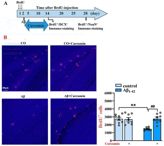Decreased BrdU+ and BrdU+/DCX+ cell levels in the DG of Aβ1–42 mice after the administration of BrdU 14 days are reversed by the curcumin treatment. (A) Flowchart of the experiment; the time for the administration of BRDU, Aβ, and curcumin; and the time for the immuno-staining of BrdU+/DCX+ and BrdU+/NeuN+. (B) Immunostaining of BrdU+ cells (14 days after BrdU treatment) in different groups (right) and a columnar statistical chart. (C) Immunostaining of BrdU+, DCX+, and BrdU+/DCX+ cells (14 days after BrdU treatment) in different groups and columnar statistical chart (down). CO: control mice; red signals: BrdU+ cells; green signals: DCX+ cells; blue background: Dapi staining. The white arrows: cells marked by BrdU+/DCX+. (B,C) n = 8 mice per group, two-way Analysis of Variance (ANOVA), followed by Sidak’s test. ** p < 0.01 vs. control mice; ## p < 0.01 vs. Aβ1–42 mice.