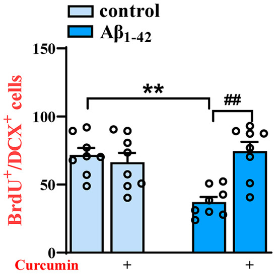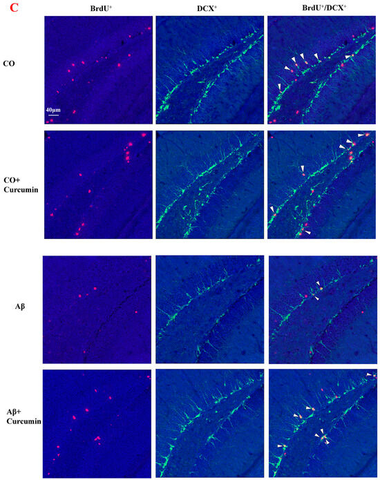 2.1. Decreased BrdU+ and BrdU+/DCX+ Cells in the DG of Aβ1–42 Mice Are Reversed via Curcumin Treatment