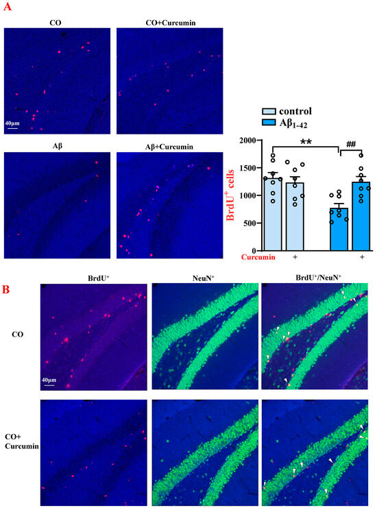 Decreased BrdU+ and BrdU+/NeuN+ cell levels in the DG of Aβ1–42 mice after the administration of BrdU for 28 days were reversed via the curcumin treatment. (A) Immunostaining of BrdU+ cells (28 days after BrdU treatment) in different groups (right) and a columnar statistical chart. (B) Immunostaining of BrdU+, NeuN+, and BrdU+/NeuN+ cells (28 days after BrdU treatment) in different groups and a columnar statistical chart (down). CO: control mice; red signals: BrdU+ cells; green signals: NeuN+ cells; blue background: Dapi staining. The white arrows: cells marked by BrdU+/ NeuN+. (A,B) n = 8 mice per group, two-way ANOVA, followed by Sidak’s test. ** p < 0.01 vs. control mice; ## p < 0.01 vs. Aβ1–42 mice.