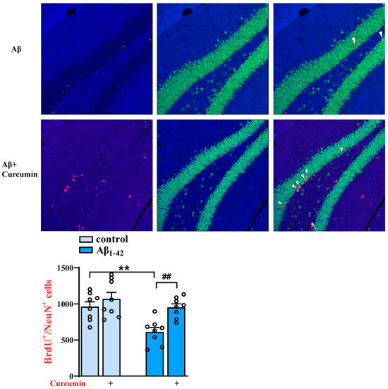 2.2. Decreased BrdU+ and BrdU+/NeuN+ Cells in the DG of Aβ1–42 Mice Are Reversed by Curcumin Treatment
