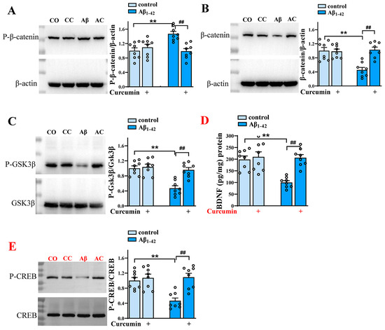 Curcumin upregulates Wnt/β-catenin signaling and BDNF content. The expression of hippocampal phospho-β-catenin (A), β-catenin (B), phospho-GSK3β (C), and phospho-CREB (E) in control mice and Aβ1–42 mice administered curcumin or vehicle. CO: control mice; CC: control +curcumin mice; Aβ: Aβ1–42-mice; AC: Aβ1–42-mice +curcumin. (D) The BDNF content (%) in the hippocampus in control mice and Aβ1–42-mice administered curcumin or vehicle. (A–E) n = 8 mice per group, two-way ANOVA, followed by Sidak’s test. ** p < 0.01 vs. control mice; ## p < 0.01 vs. Aβ1–42 mice.