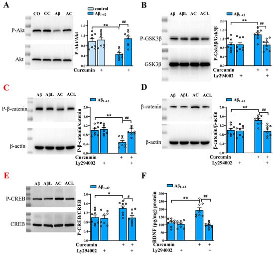 Curcumin upregulated Wnt/β-catenin and BDNF in Aβ1–42 mice through the PI3K/Akt pathway. (A) Expressions of hippocampal phospho-Akt in control mice and Aβ1–42 mice administered via curcumin or vehicle. Hippocampal phospho-GSK3β (B), phospho-β-catenin (C), and phospho-CREB (D) in Aβ1–42 mice treated with or without curcumin or Ly294002. CO: control mice; CC: control+ curcumin mice; Aβ: Aβ1–42-mice; AC: Aβ1–42-mice +curcumin. (E) The BDNF content (%) in the hippocampus in Aβ1–42 mice treated with or without curcumin or Ly294002. (A–F) n = 8 mice per group, two-way ANOVA, followed by Sidak’s test. (A) ** p < 0.01 vs. control mice; ## p < 0.01 vs. Aβ1–42 mice; (B–F) * p < 0.05 or ** p < 0.01 vs. Aβ1–42 mice; # p < 0.05 or ## p < 0.01 vs. Aβ1–42 mice +curcumin.