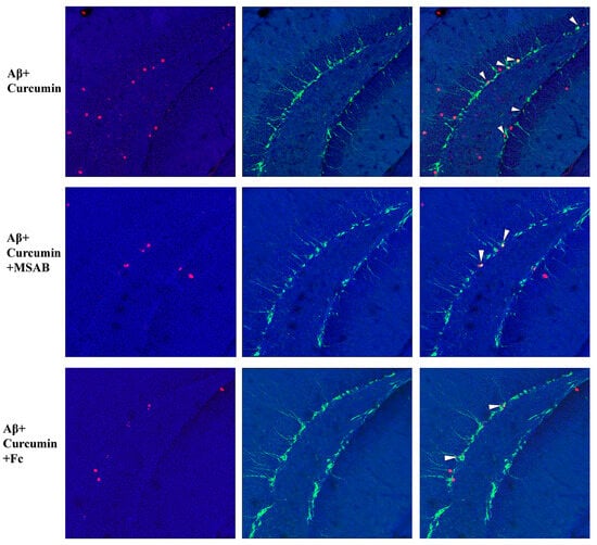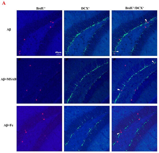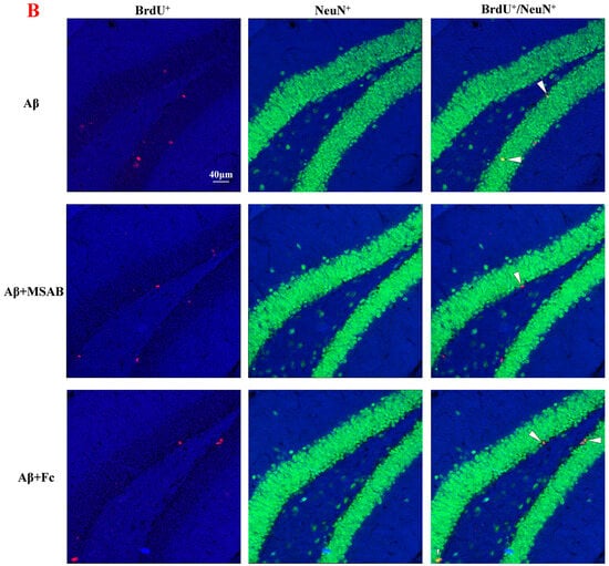 Finally, we verified the role of β-catenin and BDNF in curcumin-enhanced neurogenesis in Aβ1–42 mice. As described in the Materials and Methods section, the mice were pretreated by MSAB or Fc. As shown in Figure 5, MSAB or Fc pretreatment did not affect the amount of BrdU+/DCX+ cells in Aβ1–42 mice (F (2,42) = 18.06, p < 0.0001, Aβ1–42 vs. Aβ1–42 + MSAB: p = 0.9997; Aβ1–42 vs. Aβ1–42 + Fc: p = 0.9996; Figure 5A,C); in contrast, it reduced the expression of BrdU+/DCX+ cells in Aβ1–42 mice, which was administered via curcumin (Aβ1–42 +curcumin vs. Aβ1–42 +curcumin+ MSAB: p < 0.0001; Aβ1–42 +curcumin vs. Aβ1–42 +curcumin+ Fc: p < 0.0001; Figure 5A,C). Similarly, MSAB and Fc did not influence the amount of BrdU+/NeuN+ cells in Aβ1–42 mice (F (2,42) = 5.890, p = 0.0056, Aβ1–42 vs. Aβ1–42 + MSAB: p = 0.9597; Aβ1–42 vs. Aβ1–42 + Fc: p = 0.9971; Figure 5B,D); in contrast, the expression of BrdU+/NeuN+ cells in Aβ1–42 mice, which was administered via curcumin (Aβ1–42 +curcumin vs. Aβ1–42 +curcumin+ MSAB: p = 0.0009; Aβ1–42 +curcumin vs. Aβ1–42 +curcumin+ Fc: = 0.0001; Figure 5B,D), was reduced.
