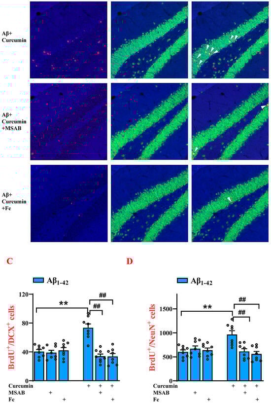 Curcumin-upregulated neurogenesis in Aβ1–42 mice via enhancing β-catenin and BDNF. (A) Immunostaining of BrdU+, DCX+, and BrdU+/DCX+ cells in Aβ1–42, Aβ1–42+MSAB, Aβ1–42+Fc, Aβ1–42 +curcumin, Aβ1–42+curcumin+MSAB, and Aβ1–42 +curcumin+Fc mice. Red signals: BrdU+ cells; green signals: DCX+ cells; blue background: Dapi staining. (B) Immunostaining of BrdU+, NeuN +, and BrdU+/NeuN+ cells in Aβ1–42, Aβ1–42+MSAB, Aβ1–42+Fc, Aβ1–42 +curcumin, Aβ1–42 +curcumin+MSAB, and Aβ1–42 +curcumin+Fc mice. Red signals: BrdU+ cells; green signals: NeuN+ cells; blue background: Dapi staining. The white arrows: cells marked by BrdU+/ NeuN+. (C) Columnar statistical chart for (A). (D) Columnar statistical chart for (B). (C,D) n = 8 mice per group, two-way ANOVA, followed by Tukey’s test. ** p < 0.01 vs. Aβ1–42 mice; ## p < 0.01 vs. Aβ1–42 mice+curcumin.