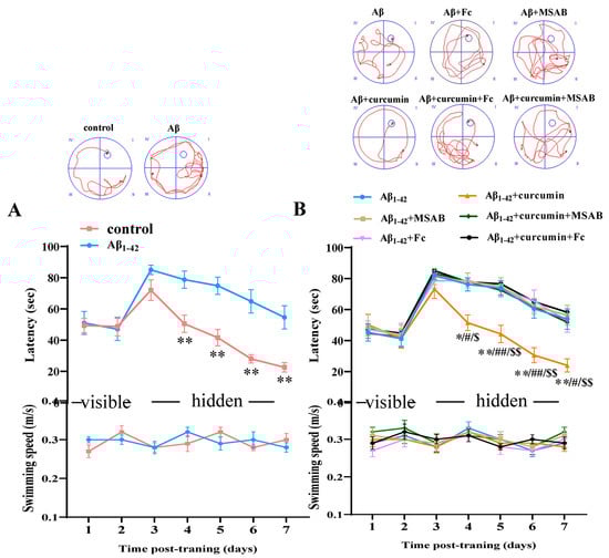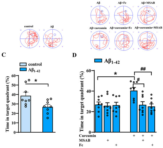 As shown in Figure 6B, curcumin administration significantly shortened the time required to find the hidden platform in Aβ1–42 mice (F (5,42) = 6.870, p < 0.0001, Aβ1–42 vs. Aβ1–42 +curcumin: p = 0.0159, day 4: p = 0.0336, day 5: p = 0.0053, day 6: p = 0.0045, day 7: p = 0.0045; Figure 6B), and there was no significant difference between Aβ1–42 mice with Aβ1–42 +Fc mice and Aβ1–42 +MSAB mice with respect to the latency of seeking hidden platforms (Aβ1–42 vs. Aβ1–42 +MSAB: p = 0.9994; Aβ1–42 vs. Aβ1–42 + Fc: p > 0.999; Figure 6B), showing that Fc and MSAB administration had no significant effects on spatial cognitive function in Aβ1–42 mice. However, Fc and MSAB prolonged the time needed to search for hidden platforms in Aβ1–42 mice which had been administered curcumin (Aβ1–42 +curcumin vs. Aβ1–42 +curcumin+ MSAB: p < 0.0001. day 4: p = 0.0169; day 5: p = 0.0089; day 6: p = 0.0025; day 7: p = 0.0104. Aβ1–42 +curcumin vs. Aβ1–42 +curcumin+ Fc: p < 0.0001; day 4: p = 0.0195; day 5: p = 0.0015; day 6: p = 0.0005; day 7: p = 0.0006; Figure 6B).
