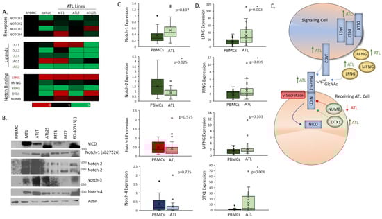 Notch-1 and binding partners are over-expressed in adult T-cell leukemia (ATL) cells. (A) Gene Array analysis of Notch receptors, ligands, and binding partners in control, healthy peripheral blood mononuclear cells (PBMCs), Jurkat cells, and three ATL lines (MT1, ATLT, and ATL25). Expression is normalized to control PBMCs and is color-coded to represent expression levels: green (up to 5-fold) is elevated fold-change compared to PBMCs. Red is repressed fold-change compared to PBMCs. Black is equal to control PBMCs (set at 1). (B) Western blot analysis of Notch receptors, Notch-1, -2, -3, and -4, including Notch intracellular domain (NICD), expression in ATL cell lines (MT1, ATLT, ATL25, and ED-40515(−)) and human T-cell leukemia virus-I (HTLV-I) infected cells (MT4 and MT2). Non-infected PBMCs served as control. Actin served as a loading control. Protein weight in kilodaltons (kDa) is shown. Notch-1 is detected with the ab27536 antibody, and NICD is detected with the NICD-Val1744 antibody. (C,D) Whisker plots of real-time PCR gene expression analysis of Notch receptors (notch 1–4) (C) in a cohort of healthy PBMCs (n = 17), primary ATL patient samples (n = 23), and Notch binding partners (lfng, mfng, rfng, and dtx1) (D) in a cohort of healthy PBMCs (n = 18–20) and primary ATL patient samples (n = 22–28); p-values are indicated. The colors of whisker blots indicated relative levels of expression (green: highly expressed, red: low expression, and blue: medium expression). (E) Graphical representation of Notch signaling in ATL cells. Green arrows represent elevated expression of genes, while red arrows represent decreased expression of genes.