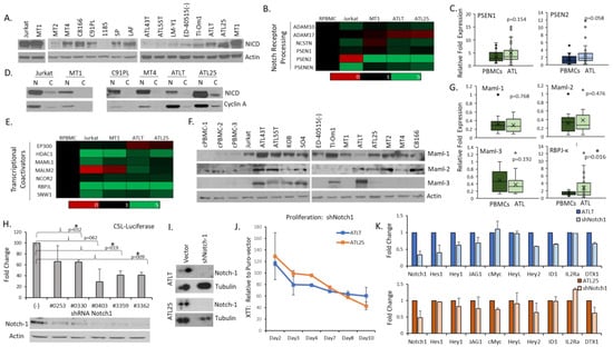 Adult T-cell leukemia (ATL) cells are dependent upon Notch-1 for Growth. (A) Western blot analysis of active Notch (NICD-Val1744) expression in ATL cell lines (MT1, ATLT, ATL25, ED-40515(−), Tl-Om1, ATL43T, ATL55T, and LM-Y1) and human T-cell leukemia virus-I (HTLV-I) infected cells (MT4, MT2, C8166, C91PL, 1185, SP, and LAF). Non-HTLV-I infected cells served as controls. Actin served as a loading control. (B) Gene Array analysis of Notch receptor processing genes in control, healthy peripheral blood mononuclear cells (PBMCs), Jurkat cell line, and three ATL lines (MT1, ATLT, and ATL25). Expression is normalized to control PBMCs and is color-coded to represent expression levels, as stated in Figure 1. (C) Whisker plots of real-time PCR analysis of presenilin genes in a cohort of healthy PBMCs (n = 18) and primary ATL patient samples (n = 28). The colors of whisker blots indicated relative levels of expression (green: highly expressed, red: low expression, and blue: medium expression). (D) Nuclear (N) and cytoplasmic (C) Western blot analysis of NICD in ATL and HTLV cells. Jurkat cells served as a control, with nuclear Cyclin A verifying the purity of cellular fractionation. (E) Gene array analysis of Notch transcriptional coactivators, as described in (B). (F) Western blot analysis of Malm proteins in ATL cell lines (MT1, ATLT, ATL25, Tl-Om1, ATL43T, ATL55T, KOB, SO4 and ED-40515(−)) and HTLV-I-infected cells (MT4, C8166, and MT2). Three non-infected cycling PBMCs (cPBMCs) and Jurkat cells served as control. Actin served as a loading control. Protein weight in kilodaltons (kDa) is shown. (G) Whisker plots of real-time PCR analysis of maml and rbpjk genes in a cohort of healthy PBMCs (n = 18–20) and primary ATL patient samples (n = 22–28). p-values are indicated. * = significance less than 0.05. The green color of whisker blots indicates a high level of expression of all genes. (H) CSL-Luciferase in transfected 293T cells. Five Notch shRNA were transfected, along with the CSL-luciferase vector. Control cells were transfected with empty vectors. Experiments were performed at least twice, and fold change was determined compared to the empty vector. p-values are indicated. * = significance less than 0.05. Corresponding protein levels of Notch-1 (ab27526) and Actin are shown for each shRNA. (I) Western blot analysis of HTLV and ATL cells infected with shRNA to Notch-1. Actin served as a control. (J) Proliferation of ATLT and ATL25 cells infected with empty vector or Notch-1 shRNAs was performed using XTT assays. Assays were performed at least twice, and XTT assays were performed in triplicate. Values represent the mean measurements compared to control cells on Days 2, 3, 4, 7, 8, and 10 days. (K) Real-time PCR analysis of Notch-associated genes following knock-down of Notch-1 by lentiviral infection of shRNA. Cells were infected at least twice, and the mean value was graphed as a fold change compared to vector-only cells. GAPDH served as an internal control.