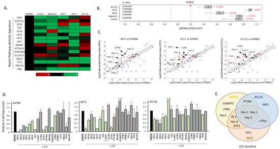 Adult T-cell leukemia (ATL) cells have a high notch pathway activity score. (A) Gene array analysis of Notch pathway activity signature genes in control, healthy peripheral blood mononuclear cells (PBMCs), two ATL lines (Jurkat, T-ALL and Nalm20, B-ALL), and three ATL lines (MT1, ATLT, and ATL25). Expression is normalized to control PBMCs and is color-coded to represent expression levels, as stated in Figure 1. (B) Notch pathway activity score generated from array data and Qiagen pathway analysis. PBMCs served as a control, with a score of 0.0. ATL and ALL cell scores are in red and represent an elevation compared to PBMCs. p-values are indicated. (C) Graphs representing the Log10 normalized gene expression of Notch pathway genes of ATL cells (MT1, ATLT, and ALT25) compared to the Log10 normalized gene expression in PBMCs. Graphs are generated using Qiagen software. (D) Real-time PCR analysis of Notch targets in Jurkat, MT1, and ATL25. GAPDH served as a control. Results are from at least two distinct cDNA preparations, from at least two different experiments and real-time PCR runs. Cells were treated with 1 µM GSI for 48 h. Fold change is compared to cells treated with DMSO control. Significant decreases are indicated in pale green with p-values of at least > 0.05. (E) Venn diagram representing common GSI-sensitive targets among Jurkat (yellow), MT1 (red), and ATL25 (blue).