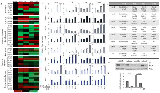 Determination of direct Notch transcriptional targets in adult T-cell leukemia (ATL) cells. (A) Gene array analysis of Notch targets involved in apoptosis, cell cycle (C.C.), cell activation (C.A.), differentiation and development, neurogenesis, immune response, and transcription factors in control, healthy peripheral blood mononuclear cells (PBMCs), Jurkat cells, and three ATL lines (MT1, ATLT, and ATL25). Expression is normalized to control PBMCs and is color-coded to represent expression levels, as detailed in Figure 1. (B) GSI-washout experiments were performed in Jurkat and ATL cells (MT1, ATLT, and ATL25). Cells were treated with 1 μM GSI for 72 h, followed by washout with or without 40 μg/μL CHX. Experiments were conducted at least twice, and RT-PCR was performed on Notch target genes. Cells treated with DMSO served as controls. (C) Table summarizing gene expression from GSI-washout experiments. Direct Notch targets were defined as loss of gene expression following GSI treatment, which was rescued upon washout and CHX treatment. (D) Western blot analysis of Jurkat and ATL cell lines treated with 1 µM GSI for 72 h. Actin served as a control. NICD is detected with the NICD-Val1744 antibody. (E) In vivo ChIP of the Hes-1 promoter following GSI treatment in MT1 and ATL25 cells. Results represent fold enrichment compared to DMSO-treated controls.