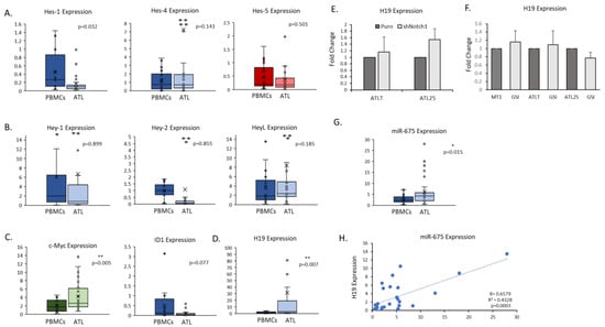 After confirming Notch direct and indirect targets in ATL cells, we next examined the expression of Notch-related genes in primary ATL patient samples. We found high expression of hes-1 in ATL patient samples (Figure 5A). Though mean hes-1 expression was not over-expressed in ATL patients compared to PBMCs, we found individual ATL patients had very high expression. We have shown that this higher hes-1 gene expression correlated with stronger NICD levels in ATL patients []. Lower hes-1 levels in ATL patients may be skewed compared to PBMCs. Monocytes, which make up 10–20% of PBMCs, and naïve B-cells, which make up 5–10% of lymphocytes in PBMCs, are known to have higher levels of hes-1; whereas CD4 and CD8 T-cells do not express high levels of hes-1 (Human Protein Atlas) [,]. The Hes family is composed of seven members, but only Hes-2, Hes-3, and Hes-6 appear to be Notch independent, whereas all three Hey family members (Hey-1, Hey-2, and Hey-L) are strongly induced by Notch []. Both families can bind E-box elements found in gene promoters; however, Hes proteins can also bind N-box elements and contain a WRPW domain that can bind distinct co-repressors. Examination of other Hes family members indicated high expression of hes-4 in ATL patient samples (Figure 5A). We also found high expression of hey family members in ATL patient samples, especially hey-L (Figure 5B). Surprisingly, we found hey-2 to be down-regulated in ATL patient samples. Hey-2 acts as a strong co-repressor of TGF-β signaling by binding to Smad-3/-4 []. The TGF-β pathway is complex in HTLV-I, with viral proteins contributing to the activation and repression of various TFG-β components. It could be that Hey-L plays a part in TGF-β signaling in ATL patients. In agreement with past studies, we found over-expression of c-myc gene expression in ATL patients compared to PBMCs (Figure 5C) []. We also found down-regulation of id1 in ATL patient cells (Figure 5C). The fact that id1 was not impacted by NICD loss and is down-regulated in ATL patients suggests that ID1 may have tumor suppressor functions in ATL cells that are currently undefined. However, like hes-1, PBMCs have high levels of id1, likely due to the higher expression of id1 in monocytes, basophils, neutrophils, and myeloid dendritic cells (Human Protein Atlas) []. Additional investigations into the role of ID1 in ATL disease are warranted. One surprising result that came from the Notch array was the high expression of the Notch-related lncRNA H19 in ATL cells (Figure 3D). H19 was one of the most highly over-expressed genes in ATL cells compared to PBMCs (Figure 3A). We, therefore, examined H19 expression in primary ATL patients compared to PBMCs. Like ATL cells, we found over-expression of H19 in primary ATL patient samples (Figure 5D). H19 is an imprinted lncRNA on chromosome 11p15.5 that is maternally expressed []. A previous report found that ATL patient cells display loss of imprinting (LOH) at the H19 allele, leading to a gain of expression from the lost parental allele []. Additional reports have suggested that Notch receptors could positively regulate H19 expression []. To determine if Notch signaling also contributed to elevated H19 expression, we infected ATL cells with Notch-1 shRNA. We did not find a loss of H19 expression when Notch-1 was knocked down (Figure 5E). Furthermore, inhibition of NICD with GSI did not prevent H19 gene expression (Figure 5F). These results show that H19 is not a direct Notch-1 target in ATL cells. Though we did see a slight increase in H19 expression following shNotch1, the result was not statistically significant. Studies have shown that a portion of H19’s oncogenic effects is due to the expression of microRNA, miR-675, located in the first exon of H19 []. We, therefore, examined miR-675 expression in ATL patient samples and found miR-675 was also over-expressed compared to normal PBMCs (Figure 5G). We also found the H19 expression correlated with miR-675 expression in ATL patient samples, suggesting both non-coding RNAs are dually regulated (Figure 5H).