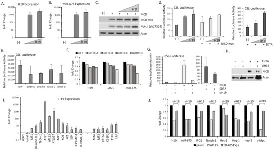For H19 expression studies, 293T cells were transfected with increasing doses of H19-pCDNA vector (pcDNa3.1(+)A009-H19; #122473 Addgene) by Polyfect transfection reagent (Qiagen, Hilden, Germany). For experiments with Notch, a myc-tagged Notch intracellular domain (NICD-myc) plasmid was co-transfected with H19. For luciferase assays, 293T cells were transfected with the Notch/CSL-firefly luciferase (CSL-Luciferase) construct by Polyfect (Qiagen, Hilden, Germany). Then, 48 h later, cells were lysed in a passive lysis buffer and assayed using the Dual Luciferase-Reporter kit (Promega, Madison, WI, USA). Fold change was determined compared to control (empty vector) transfected cells. EDTA (ethylenediaminetetraacetic acid) was added to induce ligand-independent NICD production in 293T cells.