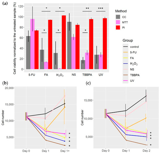 Viability assessment of the various methods in comparison to the cell count method. (a) Viability assessment normalized to the untreated sample comparison between Cell count (CC), MTT (MTT), and PI methods (PI). (b) Viability assessment with the DD Cell-Tox method (the arrows represent the cell population dynamics in the following days, with the nomenclature of day 1+). (c) Cell count of the samples at different time points. (>0.05, * 0.05, ** 0.01, *** 0.001). CC: Cell count method; MTT: MTT assay; PI: PI method; 5-FU: 5-fluorouracil; FA: Fatty acids; H2O2, NS: Nutrient starvation; TBBPA: tetrabromobisphenol A; UV: Ultraviolet light.