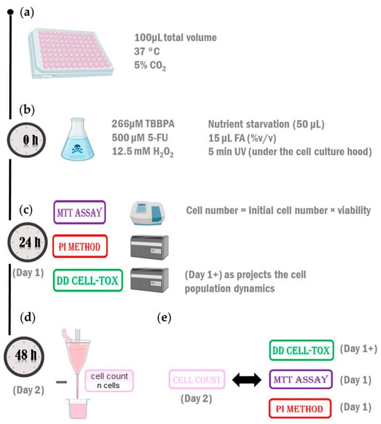 The experimental setup for DD Cell-Tox accuracy assessment in blood macrophages. (a) Cells were seeded and cultured until 100% confluency was achieved. (b) After cell attachment, the samples were treated with 12.5 mM H2O2, 266 µM TBBPA, 500 µM 5-FU, 15 µL (%v/v) FA, nutrient starvation, and 5 min exposure to UV. (c) At a time of 24 h after the treatment, cell viability was assessed with the MTT assay and the PI method. At the same time, the DD Cell-Tox method was performed. The formula to calculate the cell number prediction of the population is depicted in the graph below the formula used for the calculation. (d) At a time of 48 h after the treatment, cell viability was assessed with the cell count method. (e) The accuracy of the cell count method 48 h after treatment was compared to the DD Cell-Tox method, MTT assay, and PI method. 5-FU: 5-fluorouracil; FA: Fatty acids; H2O2; NS: Nutrient starvation; TBBPA: tetrabromobisphenol A; UV: Ultraviolet light.