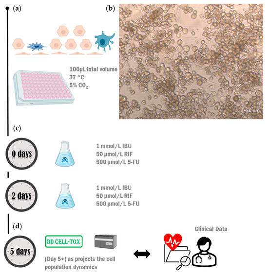 The experimental setup for DD Cell-Tox accuracy assessment in a cell-based liver model. (a) We designed a liver model with four cell types: LSEC, HSC, Kupffer cells, and hepatocytes. (b) Brightfield image at 20× magnification obtained with an inverted microscope (Axiovert 40 CFL, ZEISS, Jena, Germany). (c) We exposed the liver model to 1 mmol/L IBU, 50 µmol/L RIF, or 500 µmol/L 5-FU for 5 days (we renewed the medium after 2 days). (d) We measured the cell viability with the DD Cell-Tox method. 5-FU: 5-fluorouracil; IBU: ibuprofen; RIF: rifampicin.