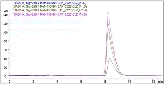 HPLC chromatograms of the CLZ and three formulations (F1, F2, and F3).