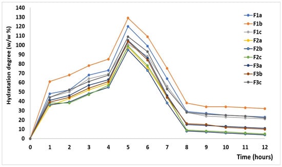 The matrix-forming polymers directly influenced the hydration characteristics of hydrophobic matrix tablets with modified release. Thus, F1a, F1b, F1c, F2a, F2b, F2c, F3a, F3b, and F3c formulations with 20–40 w/w % KOL concentration exhibited absorbent properties in the first five hours of the test, after that, in the following 2–3 h there was a slight decrease in mass. From the 8th hour, the matrix tablets were almost unchanged in size and mass. It is worth mentioning that formulations F1b, F2b, and F3b with 30 w/w % KOL showed hydration properties superior to other formulations depending on the content of the KOL and CHT. Formulations F1c, F2c, and F3c with 40 w/w % KOL and 7 w/w % CHT were characterized by adsorbent properties inferior to the other formulations [21].