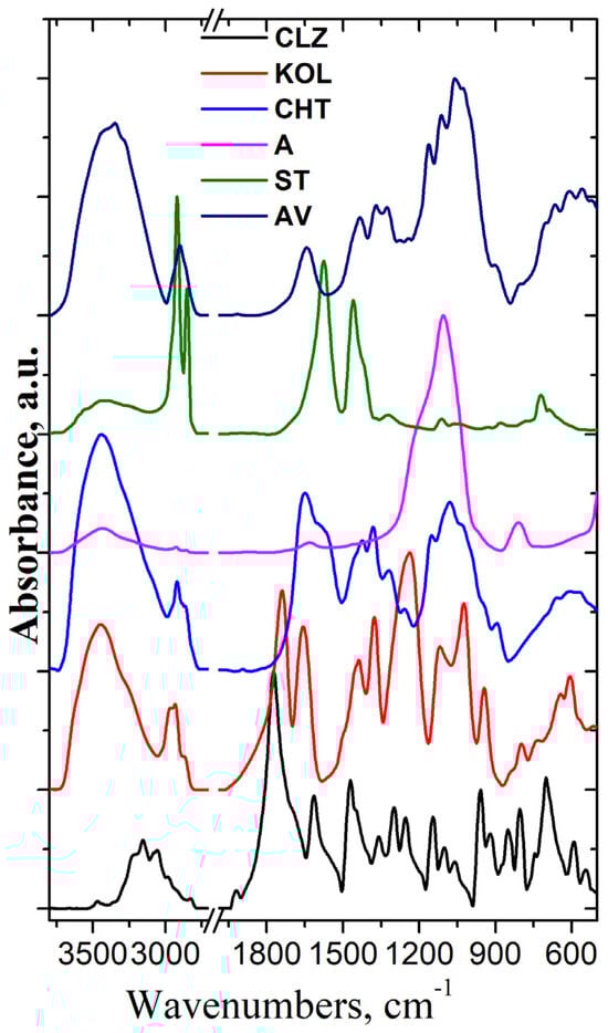 As can be seen from Figure 6, the IR spectrum of CLZ [23] shows bands at 3468, 3204, and 3156 cm−1 assigned to stretching vibration of NH groups, at 3080 and 3055 cm−1 assigned to stretching vibration of Ph-H groups, at 2982 and 2827 cm−1 assigned to stretching vibration of CH groups, at 1773 cm−1 assigned to stretching vibration of C=O groups, at 1614 cm−1 assigned to C=C groups from aromatic rings, at 1471 cm−1 assigned to the stretching vibration of C-C and CN groups and deformation vibration of CCH groups, at 1359 and 1255 cm−1 assigned to stretching vibration of CC groups and deformation vibration of CCH and CNH groups, at 1100 cm−1 assigned to stretching vibration of CN and CO groups and deformation vibration of CCH and CCC groups, at 1061 cm−1 assigned to the stretching vibration of CC and CCl groups and deformation vibration of CCH groups, at 958 cm−1 assigned to the stretching vibration of CN groups and deformation vibration of CCC groups, at 591 cm−1 assigned to deformation vibration of CNO, CCO, and CCN groups, and at 545 cm−1 assigned to stretching vibration of CO and CCl groups and deformation vibration of CCC groups [24,25]. The IR spectrum of KOL shows bands at 3447 cm−1 assigned to stretching vibration of OH groups, 2965, 2933, and 2870 cm−1 assigned to symmetric and asymmetric stretching vibration of CH groups, 1740 and 1658 cm−1 assigned to the stretching vibration of C=O groups from vinyl acetate and pyrrolidone ring, respectively; and also at bands at 1375 cm−1 assigned to the stretching vibration of COO groups, at 1236 cm−1 assigned to the stretching vibration of CC groups and deformation vibration of CCH and CNH groups, at 1119 cm−1 assigned to stretching vibration of CN and CO groups and deformation vibration of CCH and CCC groups, at 1024 cm−1 assigned to stretching vibration of CC and CCl groups and deformation vibration of CCH groups, and at 944 cm−1 assigned to the stretching vibration of CN groups [26].