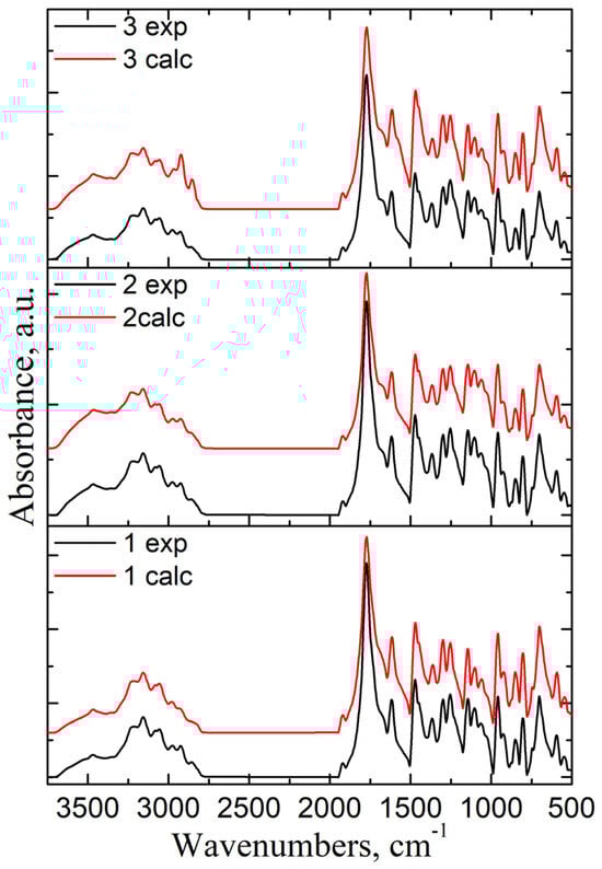 Comparison between experimental and calculated IR spectra of some studied formulations F1b, F2b, and F3b.