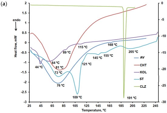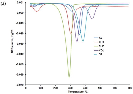 The data of Figure 9a,b compare the differential thermogravimetric curves (DTG) curves for CLZ, CHT, AV, KOL, ST, and the formulations (F1b, F2b, and F3b). The recorded TG, DTG, and differential thermal analysis (DTA) curves and their interpretation with Mettler Toledo’s STAR software 2.7.11b revealed the main thermal characteristics given in Table 4 and Table 5.