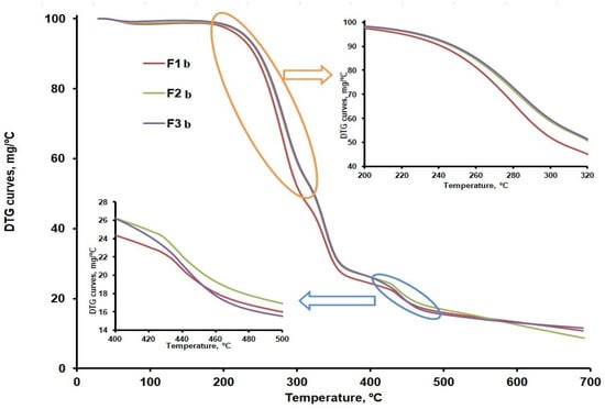 The F1b, F2b, and F3b formulations have a single peak at 338 °C in the third stage, within the 326–359 °C temperature range, which proves an excellent compatibility of the excipients used [38]. According to the TG curves shown comparatively in Figure 10 and to the main thermogravimetric characteristics shown in Table 5, the last step of decomposition shows more significant differences between the three formulations, which may be linked to various amounts of KOL. This is accounted for by the fact that, according to the data in Table 4, the last stage of thermal decomposition of the KOL excipient occurs within the 416–473 °C temperature range. According to Figure 6b, at temperatures above 500 °C, a small peak can be distinguished for the F2b formulation that could be linked to the last stage mass loss in the case of CHT. This would indicate more of this excipient in the F2b formulation.