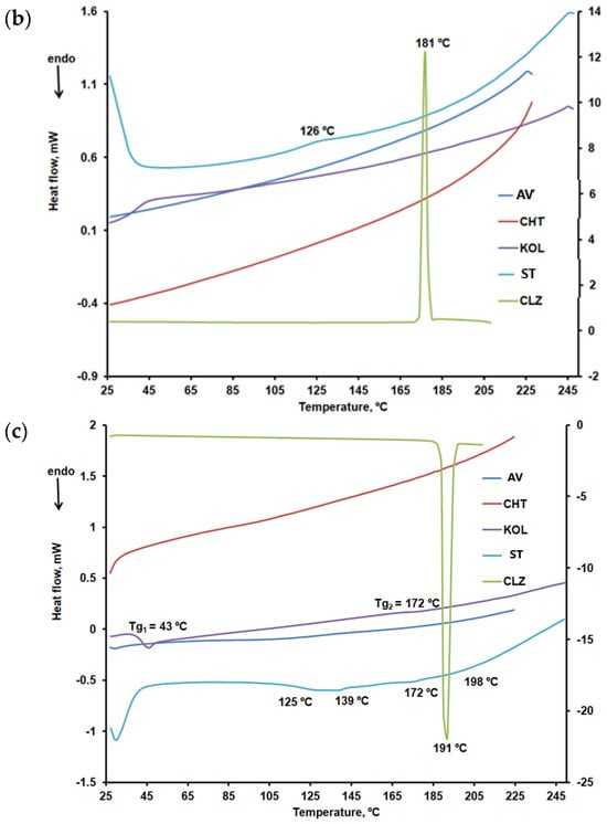 (a) DSC curves: CLZ within the 25–210 °C temperature range, AV and CHT within the 25–230 °C temperature range, and KOL and ST within the 25–50 °C temperature range (first heating run). (b) DSC curves: CLZ within the 25–210 °C temperature range, AV and CHT within the 25–230 °C temperature range, and KOL and ST within the 25–250 °C temperature range (cooling run). (c) DSC curves: CLZ within the 25–210 °C temperature range, AV and CHT within the 25–230 °C temperature range, and KOL and ST within the 25–250 °C temperature range (second heating run).