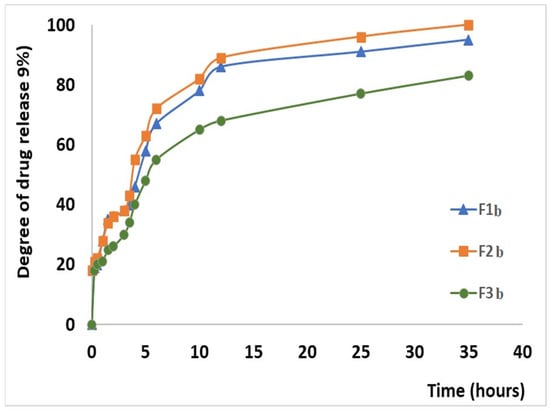The results obtained during the in vitro dissolution test reveal the prolonged release of CLZ from the studied formulations when compared to the release of CLZ from an industrial product [45]. On the other hand, these results also highlighted the central role of the KOL exerted on matrix tablet release characteristics. The released amount of CLZ varied with the percentage of KOL for all studied formulations (Figure 10). A particular behavior was observed for F2b containing 30 (w/w) % KOL, released 26.39 (w/w) % of CLZ during the first two hours of the dissolution test in simulated gastric fluid. Moreover, that the formulation released 87.05 (w/w) % CLZ of the 12 h and 98.55 (w/w)% at the end of the 36 h of testing. It was also found that by the increasing the CHT concentration in the formulation decreased the CLZ release rate from the matrix tablets. Thus, in the F1c, F2c, and F3c formulations containing 40 (w/w) % KOL and 7 (w/w) % CHT, at the end of the dissolution test, the amount of CLZ is the smallest. The F1b containing 5% CHT released 95.76% of CLZ, F2b with 5% CHT released 98.55% CLZ, and F3b with 5% CHT generated only 85.15% CLZ (Figure 13).