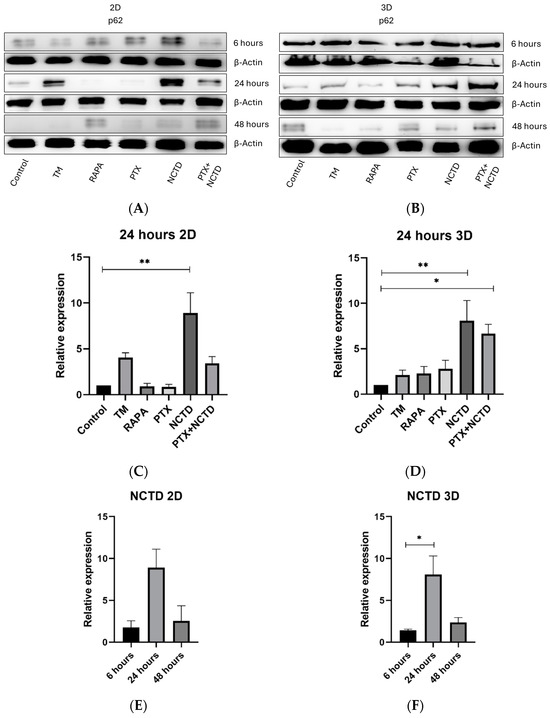 2.3. Autophagy p62 Expression in 2D and 3D Cultures