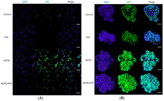 2.4. Expression of p62 in 2D and 3D Cultures by Immunofluorescence