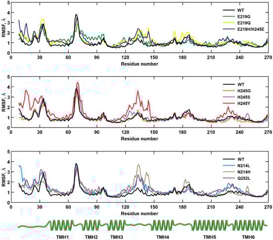 The RMSF of backbone atoms for a-subunit of WT and nine mutations. At the bottom is a schematic representation of the topology of the a-subunit that is characterized by six transmembrane helices. Hereafter, each color of the graph corresponds to the certain mutation.