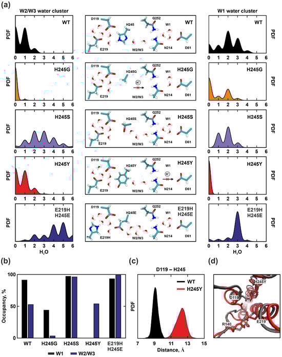 On the contrary, substitution of the aH245 with a polar serine led to increased hydration of almost all conservative amino acids compared to WT (Figure 4a,b). The Ser residue, with a hydroxyl group, could directly participate in the proton transfer to aN214. However, the minimum observed distance between them was 5.65 Å which is large for the direct transfer. A chain consisting of an average of two or three water molecules was found between these residues, increasing the capacity of W2 and W3 clusters. Water together with residues aE219, aD119, and aH245S formed a network of hydrogen bonds through which the proton could reach aN214; the aH245S substitution had no effect on the W1 cluster, and the proton transfer chain was preserved. Thus, solely based on geometric considerations, substitution of the large imidazole ring of histidine with residues having small side chains may not necessarily lead to increased hydration. The polarity of the substituted residue was also found to be a crucial factor in facilitating the water molecules’ penetration into the inlet half-channel and maintaining the proton transport.
