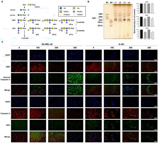 - Hamamura, K.; Furukawa, K.; Hayashi, T.; Hattori, T.; Nakano, J.; Nakashima, H.; Okuda, T.; Mizutani, H.; Hattori, H.; Ueda, M.; et al. Ganglioside GD3 promotes cell growth and invasion through p130Cas and paxillin in malignant melanoma cells. Proc. Natl. Acad. Sci. USA 2005, 102, 11041–11046. [Google Scholar] [CrossRef]