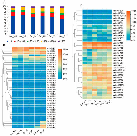 Expression patterns of miRNAs in mature roots (MR), young roots (YR), stems (S), mature leaves (ML), young leaves (YL) and flowers (F) of S. miltiorrhiza. (A) Percentage of miRNAs with different expression abundances in tissues analyzed. MiRNAs with normalized expression values less than 10, greater than 10 to 50, greater than 50 to 100, greater than 100 to 1000, and greater than 1000 were classified into very lowly, lowly, moderately, highly, and very highly expressed, respectively. (B,C) Heatmaps of expression levels of novel (B) and known (C) miRNAs. The color scale represents log2 (transformed normalized expression values). The heatmap was created using TBtools [51].