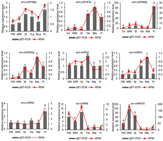 RNA used for qRT-PCR was from the same tissues for sRNA sequencing. For analysis of target gene expression, 1 μg RNA was reverse-transcribed into cDNA using the PrimeScript RT reagent kit (Takara, Shiga, Japan). Gene-specific primers were designed using Primer Premier 5 (Table S9). The expected length of amplicons ranged from 80 bp to 200 bp. SmUBQ10 was utilized as an internal control. The expression of miRNAs was analyzed using the poly(A) adaptor RT-PCR method [65]. Primers used for the selected miRNAs were designed according to the recommended guidelines [65]. The 5.8S rRNA was chosen as a reference. Gene expression data from three biological replicates were normalized. ANOVA (analysis of variance) was performed using SPSS (Version 19.0, IBM, Chicago, IL, USA). A significance level of p < 0.05 was considered as statistically significant, and a significance level of p < 0.01 was considered as highly significant.