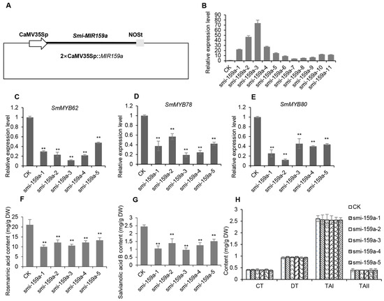 2.6. Smi-miR159a Regulates the Biosynthesis of RA and SalB but Not Tanshinones in S. miltiorrhiza