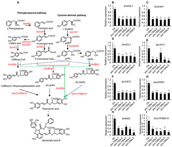 Further examining the expression of enzyme genes involved in the RA synthesis pathway using the qRT-PCR method showed that SmPAL1, SmC4H1, Sm4CL1, SmTAT1, SmTAT3, SmHPPR1, SmRAS, and SmCYP98A14 were significantly decreased in the smi-miR159a-overexpressed hairy roots compared with the control [58] (Figure 7). The results suggested that smi-miR159a regulated RA and SalB biosynthesis through down-regulation of various enzyme genes.
