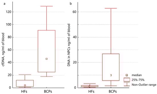 The DNA concentration isolated from plasma or NPCs was estimated by qPCR, specific for LINE-1. A significant increase in the plasma DNA concentration was found for untreated BCPs (n = 20) compared to HFs (n = 15) (median 46 versus 4 ng/mL of blood, p = 0.0026, Mann–Whitney U test) (Figure 1a), which coincides with previous studies [,]. Moreover, significant differences were found for NPC–DNA in BCPs and HFs (median of DNA was 9.9 versus 1.05 ng/mL of blood, p = 0.0041, Mann–Whitney U test) (Figure 1b). Thus, using antibodies against histones by affine chromatography, approximately one-quarter of cell-free DNA can be isolated.