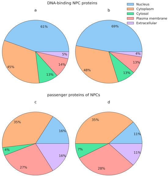 In addition to DNA-binding proteins, NPCs include proteins that do not directly bind DNA (passenger proteins). The passenger protein analysis is no less important for understanding the processes of NPC formation and its structure, as well as its functions and circulation peculiarities. The comparative analysis of functional enrichment, performed using FunRich 3.13, showed that proteins of cytoplasm (35% each), plasma membrane (27% and 28%), and nucleus (16% and 11%) prevailed among the passenger proteins in the composition of NPCs circulating in the blood of HFs and BCPs (Figure 3c,d).