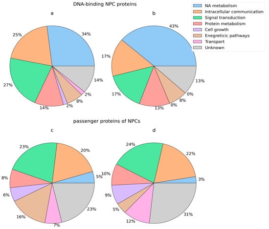 Using bioinformatics analysis, 38 types of DNA-binding motifs were identified in NPC proteins in this study, which allowed us to conditionally divide NPC proteins into nucleic acid-binding and passenger proteins, which account for 62% of all proteins. The share of proteins regulating nucleic acid metabolism increases in the composition of DNA-binding proteins and the share of proteins involved in the processes of intercellular communication and signal transduction decreases, while the share of transport proteins increases in the composition of passenger proteins and the share of proteins of energetic biological pathways decreases.