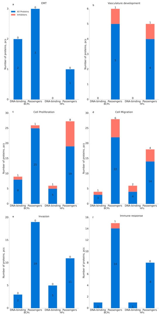 NPC proteins associated with carcinogenesis in blood of HFs and BCPs: (a) EMT, (b) vasculature development, (c) cell proliferation, (d) cell migration, (e) invasion, (f) immune response.