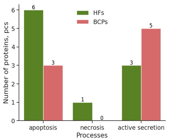 On the next stage, to identify proteins involved in the mechanisms of cell-free DNA appearance in the bloodstream (apoptosis, necrosis, active secretion), the proteomes of NPCs from the blood of HFs and BCPs were analyzed using QuickGO 2.0 using GO:00006915 (apoptotic process, GO:00006915), GO:0070266 (necrotic process, GO:0070266), and GO:0046903 (secretion, GO:0046903).