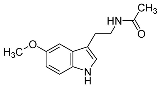 Melatonin is an endogenous transmitter, present in almost all organs and tissues, that regulates many physiological functions: (i) circadian sleep–wake and neuroendocrine cycles, (ii) blood pressure and autonomic cardiovascular activity, (iii) bone formation and protection, (iv) skin functions, (v) inflammatory response, and (vi) protection against oxidative stress [1]. Such a peculiar pharmacological profile results from a variety of mechanisms of action taking place in the various cell compartments, including the cytoplasm, mitochondria, and nucleus, as well as in the extracellular matrix. Melatonin (Figure 1) passively diffuses through the biological membranes thanks to its low molecular weight (232.3 Da), lipophilicity (logPn-oct/w = 1.32), and lack of acid/base equilibrium ionization [2].