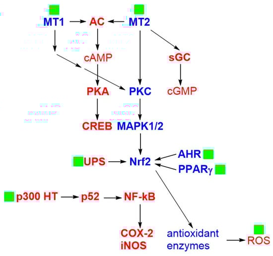 The main mechanisms of action of melatonin underlying its antioxidant and anti-inflammatory properties (see text for details). Melatonin is represented as a green filled square; the proteins that are positively modulated or upregulated are in blue; and the proteins that are negatively modulated or downregulated are in red. The levels of the second messengers and enzymes are in blue or red to indicate, respectively, their increase or decrease. Abbreviations (listed in the same order as they are mentioned in the text): MT1: melatonin receptor 1; MT2: melatonin receptor 2; PKA: protein kinase A; CREB: cAMP responsive element-binding protein; PKC: protein kinase C; MAPK1/2: mitogen-activated protein kinases 1 and 2; Nrf2: nuclear factor erythroid 2-related factor 2; AHR: aryl hydrocarbon receptor; PPARγ: peroxisome proliferator-activated receptor γ; UPS: ubiquitin–proteasome system; ROS: reactive oxygen species; COX-2: cyclooxygenase-2; iNOS: inducible nitric oxide synthase; p300 HAT: p300 histone acetyltransferase; NF-κB: nuclear factor kappa-light-chain-enhancer of activated B cells; AC: adenylate cyclase; and sGC: soluble guanylate cyclase.