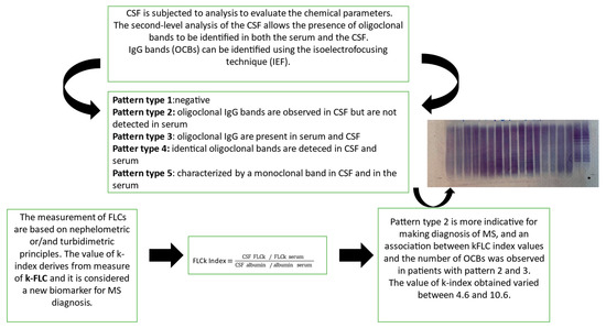 The presence of OCBs (type 2 and/or type 3 profiles) in CSF supports the diagnostic certainty for MS in terms of sensitivity and specificity aligning with the McDonald criteria [13,19] and highlighting their pivotal role—they are detected in >90% of MS cases [11]. In recent decades, several studies have explored potential biomarkers for MS. In CSF, the recognition of intrathecal IgG synthesis (detectable by OCBs), in conjunction with a high value of IgG index, can contribute to correctly diagnosing MS [16]. As reported in the McDonald criteria, the presence of OCBs in CSF is considered the gold standard for the qualitative diagnosis of MS [8]. Nevertheless, their determination is time-consuming and subject to an “eye meter analysis”, which requires high expertise and limits the execution to specialized centers [20,21]. Interestingly, in the last few years, new biomarkers for intrathecal synthesis have been discovered since, besides the intact immunoglobulins, an excess of free kappa (KFLC) and lambda light chains (λFLC) has been produced from plasma B cells and accumulated in the CSF of MS patients [21,22]