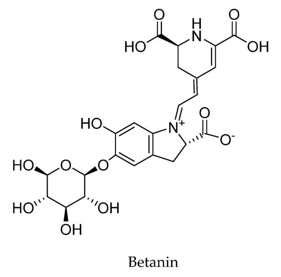 - Esatbeyoglu, T.; Wagner, A.E.; Motafakkerazad, R.; Nakajima, Y.; Matsugo, S.; Rimbach, G. Free radical scavenging and antioxidant activity of betanin: Electron spin resonance spectroscopy studies and studies in cultured cells. Food Chem. Toxicol. 2014, 73, 119–126. [Google Scholar] [CrossRef]